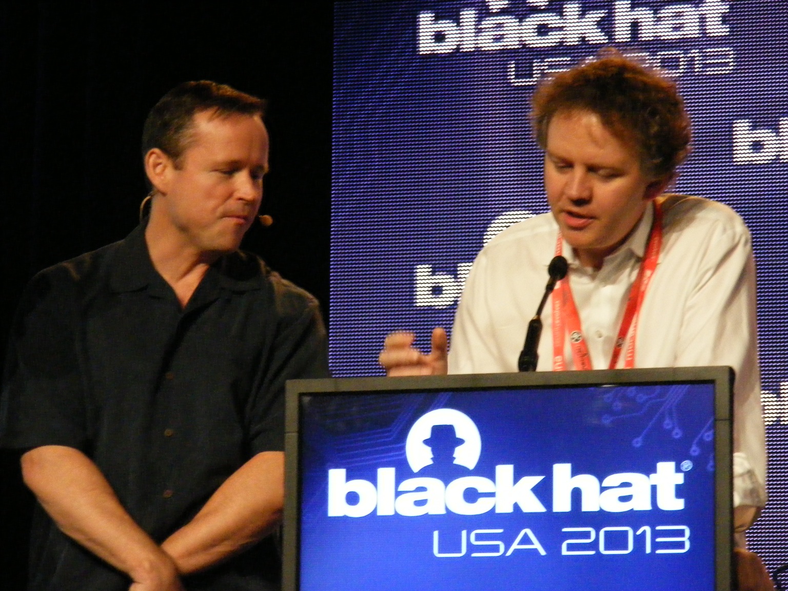 One of those moments at Black Hat. Brian Krebs (left) had given a presentation on DDoS services, in which he criticized the DDoS protection service Cloudflare for providing DDoS protection to the web sites where you can purchase those services. Krebs complained this was a conflict of interest. During the Q&A session, Cloudflare CEO Matthew Prince (right) invited himself up to the podium to debate Krebs. Prince defended his position on free speech grounds. He said he would comply with any court order, but would not refuse service to any web site otherwise. βItβs not my job to censor the Internet.β He also got several digs into Krebs for not responding to his repeated offers to discuss this on the phone.
